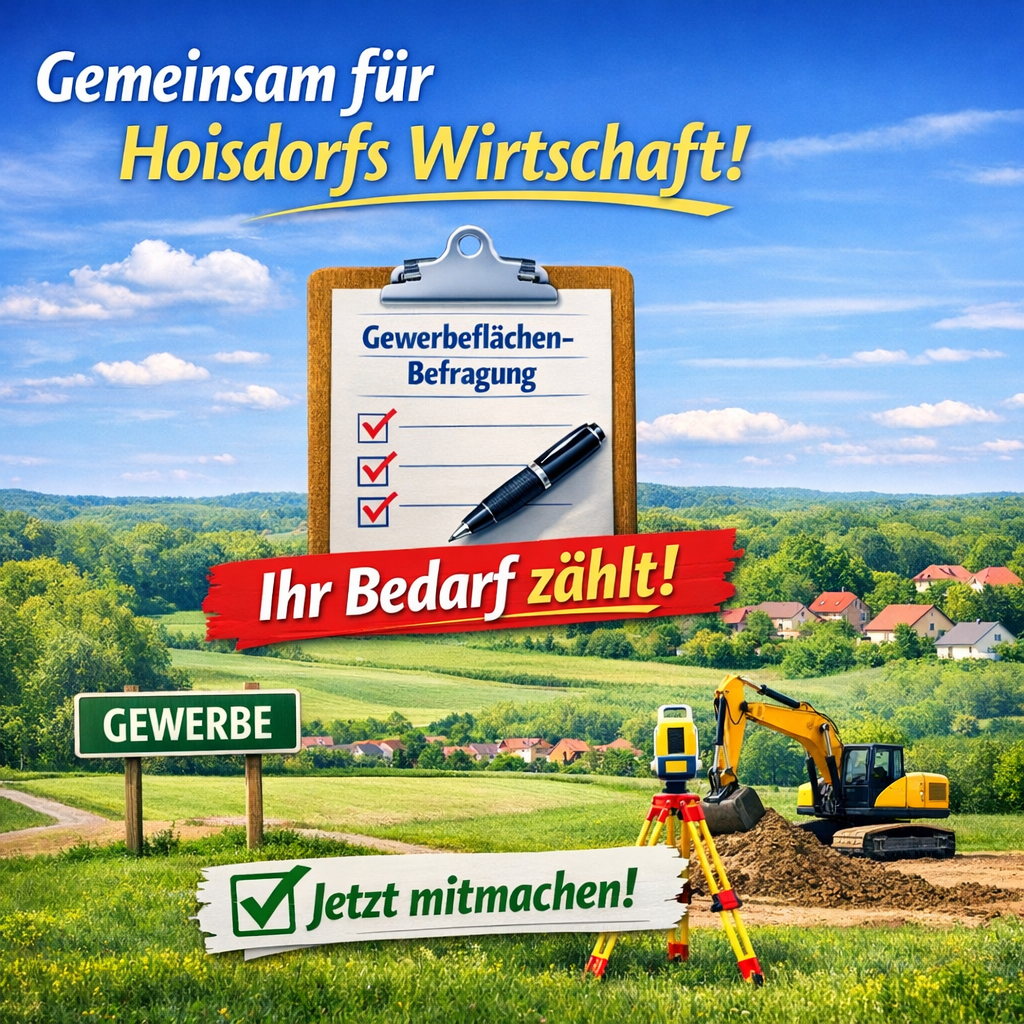 Auch wenn mögliche Gewerbeflächen nicht kurzfristig realisiert werden können, ist es entscheidend, jetzt ein realistisches Bild des Bedarfs zu erhalten. Jede Teilnahme hilft uns, die wirtschaftlichen Interessen Hoisdorfs geschlossen zu vertreten.