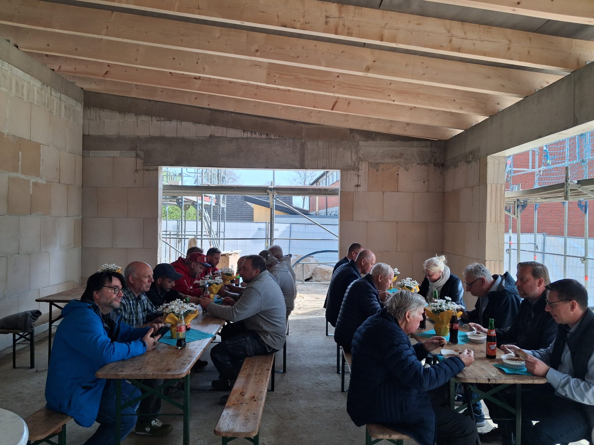 Zum Richtfest erschienen neben den bereits genannten und weiteren Gemeindevertretern auch die Schulleitung der Grundschule Hoisdorf, Franziska Matthes, sowie der langjährige Hoisdorfer Bürgermeister (a.D.), Dieter Schippmann sowie der damalige Bauausschussvorsitzende, Heiner Putzbach, die bereits in ihrer Legislaturperiode beide die Basis für diesen Bau schafften.